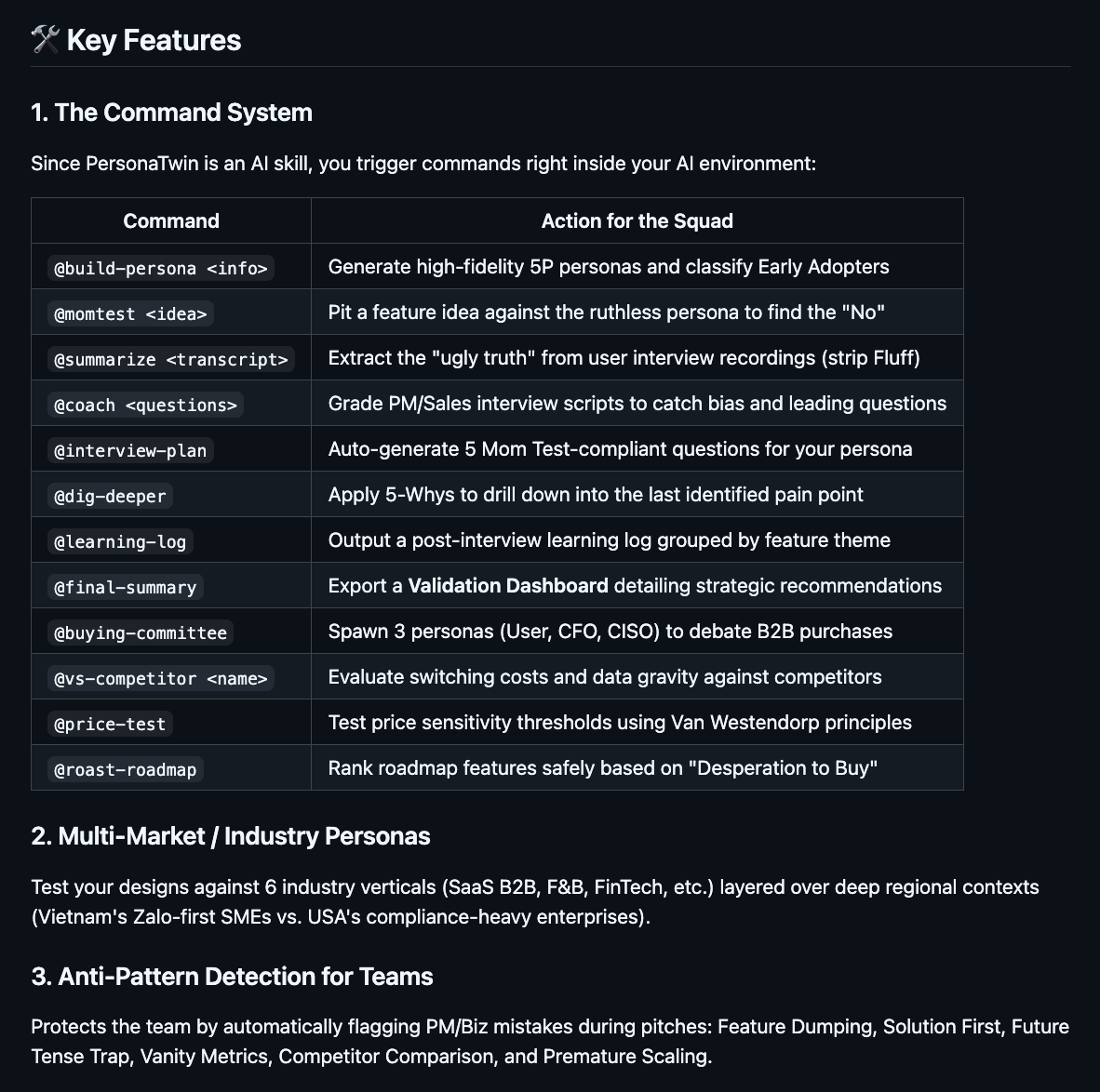 Xuất phát từ nỗi đau từng bị lùa gà bởi khách hàng khen xã giao, mình có build cái skill PersonaTwin, publish nó lên GitHub để team có thể cắm trực tiếp vào CLI hoặc AI Agent của IDE.